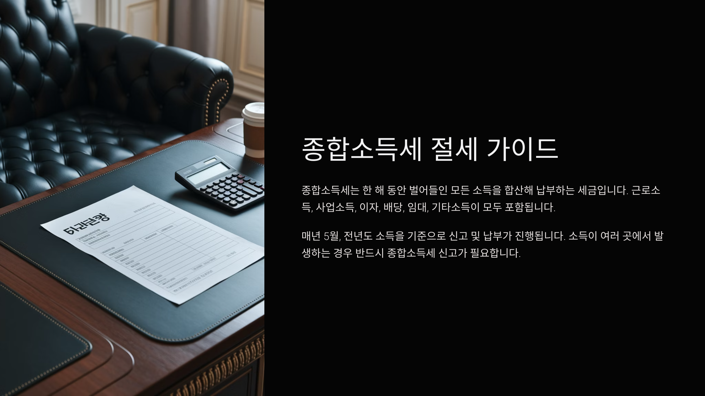 종합소득세는 한 해 동안 벌어들인 소득을 모두 합산해서 납부하는 세금이에요. 근로소득, 사업소득, 이자, 배당, 임대, 기타 소득이 모두 포함되죠. 매년 5월, 전년도 소득을 기준으로 신고 및 납부가 진행돼요.