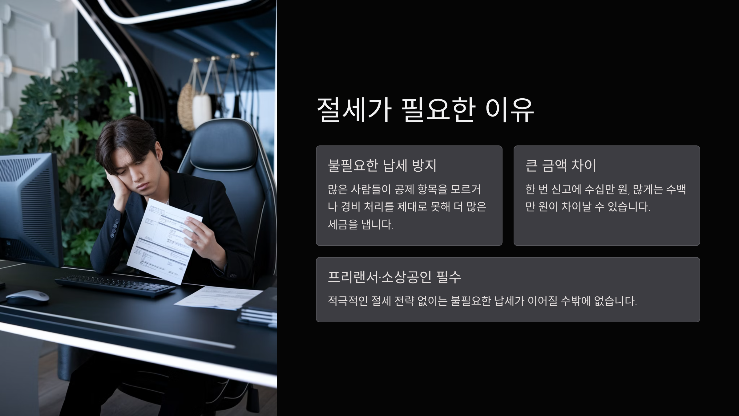 특히 프리랜서나 소상공인들은 적극적인 절세 전략이 없으면 불필요한 납세가 이어질 수밖에 없어요. 한 번 신고에 수십만 원, 많게는 수백만 원이 왔다 갔다 하니까 반드시 준비가 필요하답니다.