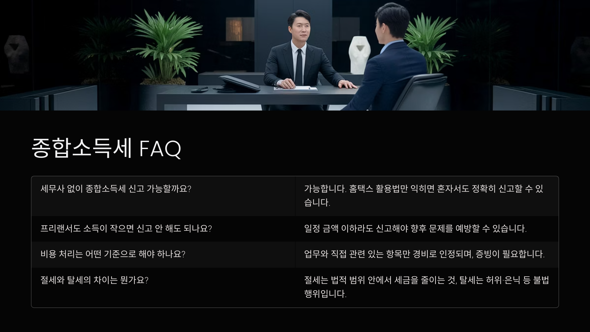 - 세금에 대한 이해도가 낮고 소득 구조가 복잡하다면 세무사 이용 권장