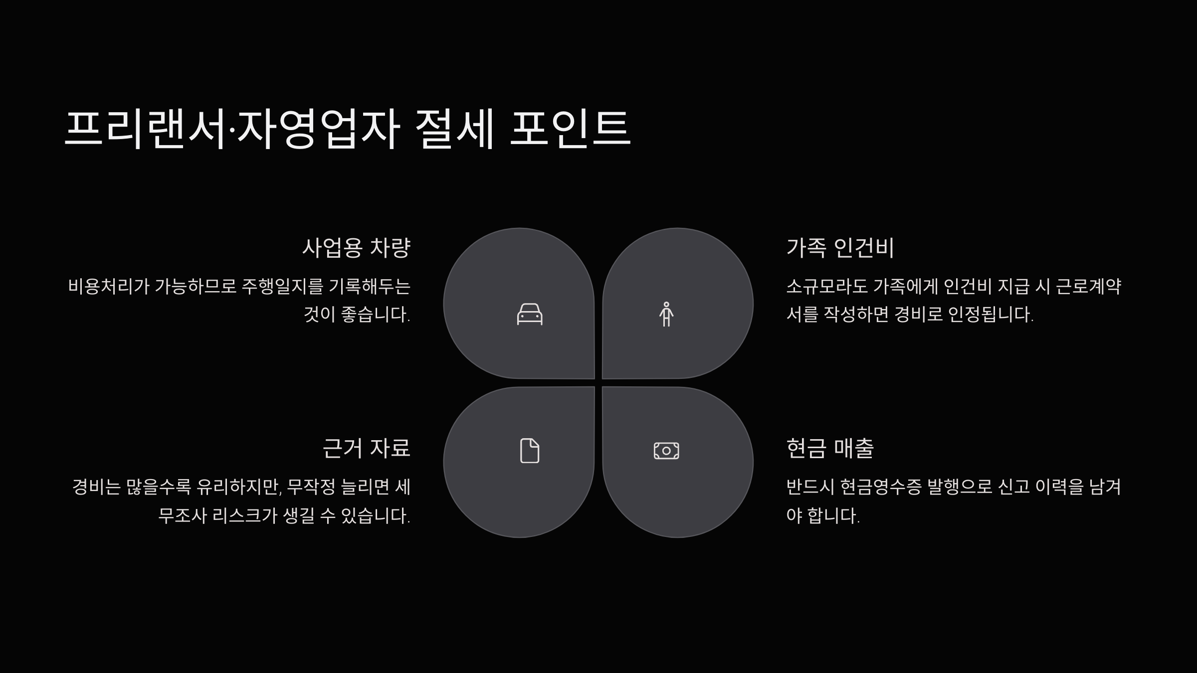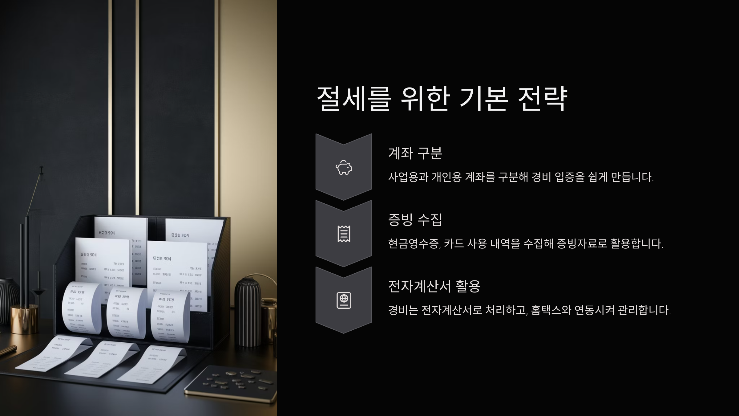 절세는 소득을 숨기는 게 아니라 비용과 공제를 정당하게 챙기는 거예요. 가장 기본이 되는 전략은 다음과 같아요.